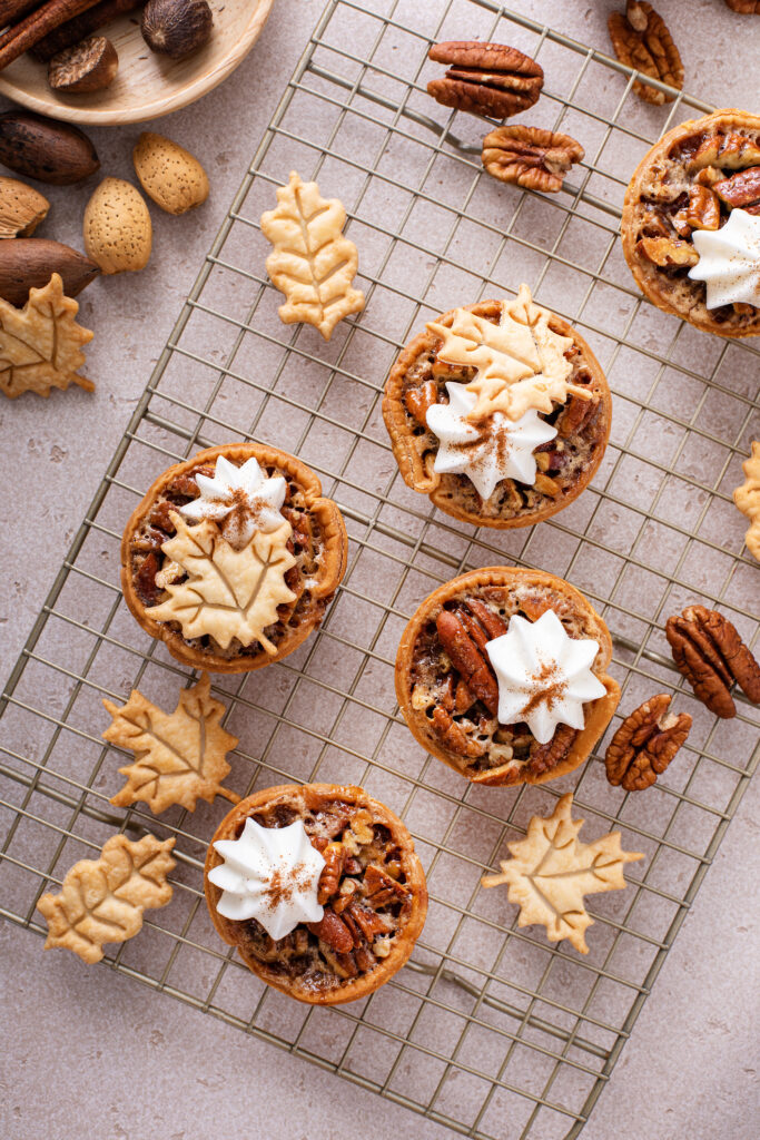 - Top each mini pecan pie with a dollop of whipped cream and gently place a fall leaf decoration on top.