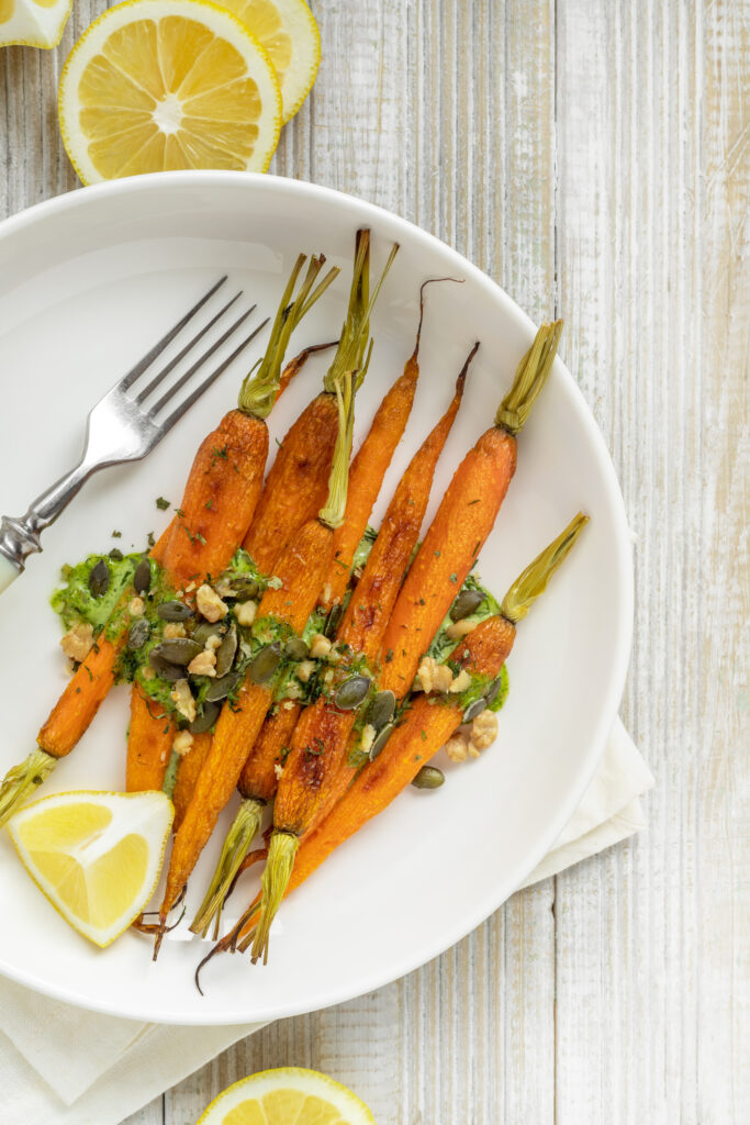 - Once the carrots are roasted, remove them from the oven and transfer to a serving platter. Drizzle the herb pesto over the warm carrots or serve it on the side for dipping.